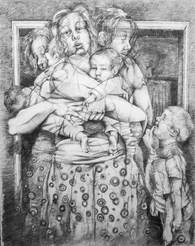Rene Leighty’s exhibit, “The Reality of Motherhood,” depicts the changes that occur in a women’s body that come naturally when having children. The artist describes her artwork as contemporary, expressive, dramatic, personal, and more importantly, demonstrates the reality of motherhood. “I used repetitive lines and shapes to display an appearance of movement and merged together a layering of multiple images in graphite and charcoal,” said Leighty. “The process is similar to the triple exposure technique in photography, with a repetition of recognizable body parts and overlapping imagery in my descriptions of a hectic life.”