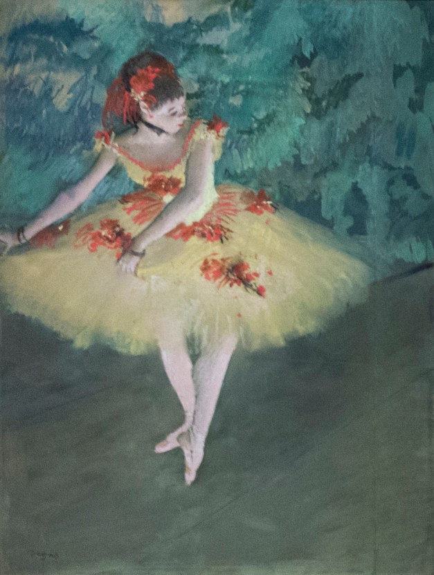 "Illuminated by gas footlights in the midst of a performance, a dancer “makes points,” or draws forms with her pointed foot. Edgar Degas’s daring, asymmetrical composition and the angled perspective he produced by the diagonal lines of the floorboards emphasize the sensation of plunging space. Degas is best known as a painter of ballet dancers, whether rehearsing in a studio or dancing on stage. He was captivated by their sometimes graceful, sometimes awkward positions, which he captured in a variety of media over the course of his career."