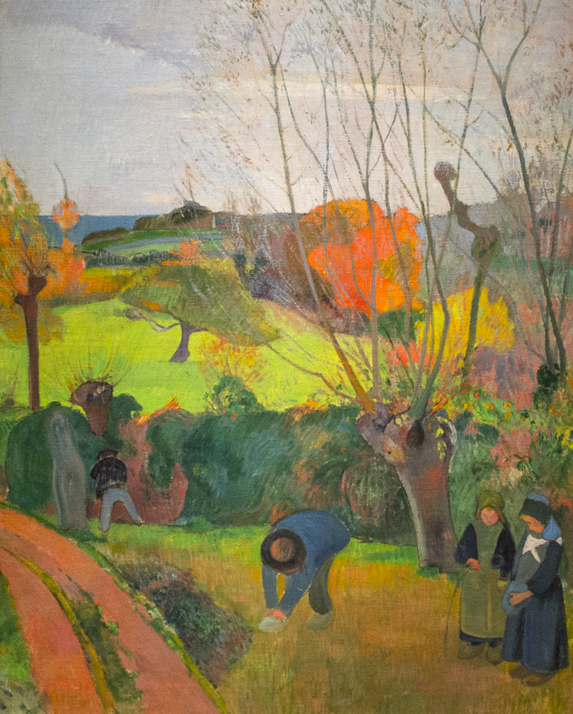 Fleeing what he felt was the overly civilized and decadent environment of Paris, Paul Gauguin lived periodically in the remote and rugged Brittany region of northwestern France. In works such as this, he sought to convey traditional village life, which he considered an antidote to the ills of modern society. Unlike the Impressionists, Gauguin did not aim to objectively reproduce the natural world. Rather, through a careful synthesis of exaggerated line, form, and color, he strove to capture the essence of his subjects as filtered through his own perceptions.