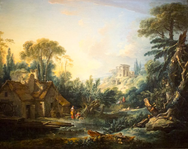 French 18th-century painters would often allude to the work of their 17th-century predecessors. Here, Boucher refers to landscapes by the French classical painter Claude Lorrain, Mill on the Tiber. Both paintings feature a water mill balanced by trees on the opposite side of the composition. Furthermore, in this landscape Boucher includes a temple in the distance that is based on the Temple of the Sybil at Tivoli, another favorite classical Claudian motif. Compared to his 17th-century predecessor, Boucher applies paint more thickly, in lighter strokes, resulting in a lush, decorative density typical of the Rococo.