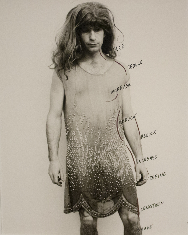 This photograph, from a series titled Improved Photographs, depicts artist William Wegman dressed as a woman. Handwritten texts on the print's surface are meant to emulate a magazine editor's comments to "improve" a model's body. With characteristic wit and humor, Wegman exposes the deceptive nature of editorial and fashion photography, while also poking fun at idealized gender norms for physical appearance.