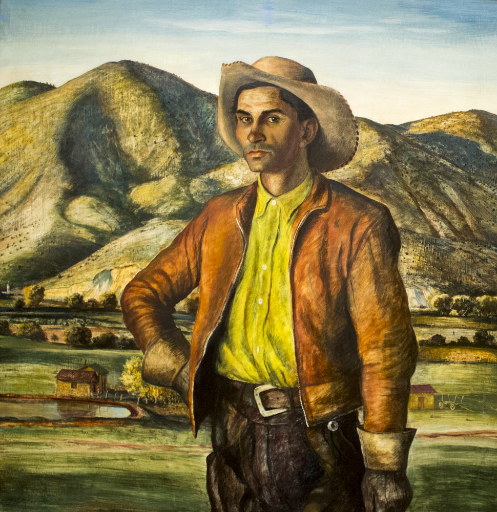 "Born and raised in Roswell, New Mexico, Peter Hurd painted the people and landscape of nearby San Patricio, where he maintained a cattle ranch. José Herrera was a farm hand on the Hurd ranch for more than 20 years. Hurd painted his friend many times and once called him "one of the most paintogenic people I know." Here he is shown looking directly out at the viewer against a panoramic view of the Hondo Valley. Filling up much of the composition, Herrera appears as strong as the mountain range behind him. The painter's use of tempera accentuates the effects of arid land and air integral to the scene. Hurd convinced his famous brother-in-law Andrew Wyeth also to adopt the medium."