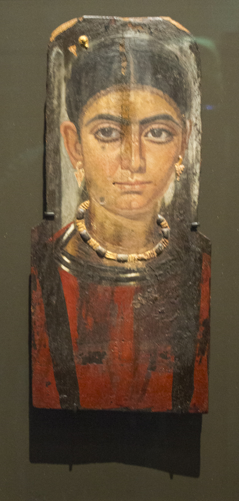 This portrait of an unknown woman was made when Egypt was part of the Roman Empire. It was meant to be placed over the face of a mummy. The portrait is arresting: her wide eyes, framed and emphasized by her heavy brows, stare out at the viewer as though she is alive today. The artist painted it using the encaustic technique. Mixing organic colors in hot beeswax, he applied the hot paint to a specially prepared wooden board. One Greek writer, the so-called Pseudo-Plutarch, appropriately commented: "A beautiful woman leaves in the heart of an indifferent man an image as fleeting as a painting on water. In the heart of a lover, this image is fixed with fire like an encaustic painting, which time can never erase."