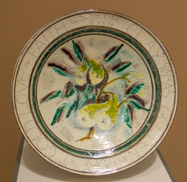 Henry Varnum Poor began his artistic career with painting and drawing, but then turned to ceramics for his livelihood. He became one of America's leading ceramicists of the 1920s. Poor, a self-taught potter, thought of ceramics as canvases for his compositions, thus aligning his work more with contemporary paintings than ceramics. The abstract sgraffito decoration, a technique by which slip or glaze is incised to reveal the clay body, and the limited color range are characteristic of Poor's ceramics. The artist made the dish in honor of his parents, Alfred J. Poor and Josephine Graham Poor, whose names encircle the outer rim of the dish. The top of the rim reads: "Love and faith and sometimes even clay can be as golden as the purest gold."