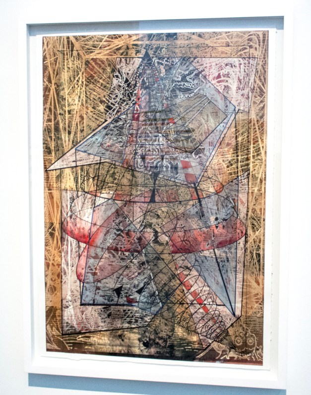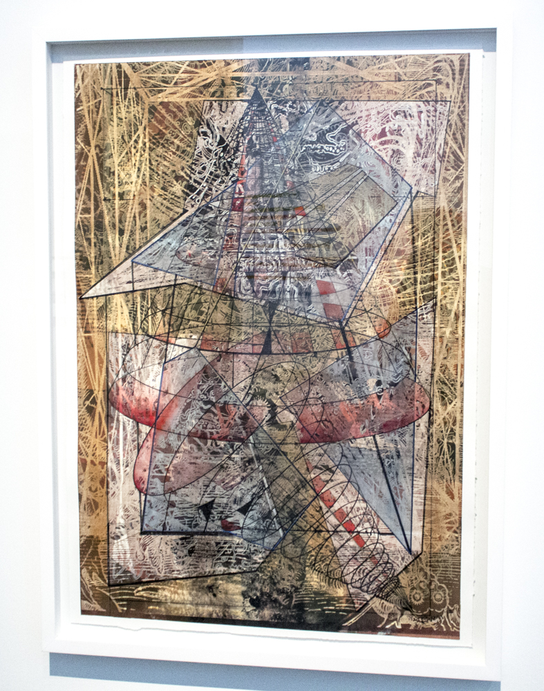 "This complex work is the result of overlaying of images. The object’s color scheme is primarily golden yellow, pale blue, burgundy, white and black. The image is so complicated that it is somewhat difficult to read all of the layers. The overall image has a structure of linked geometric lines superimposed upon it and a spiraling linear vortex motif begins in the lower right corner, tilts and expands as it moves toward the upper left lower portion of the print."