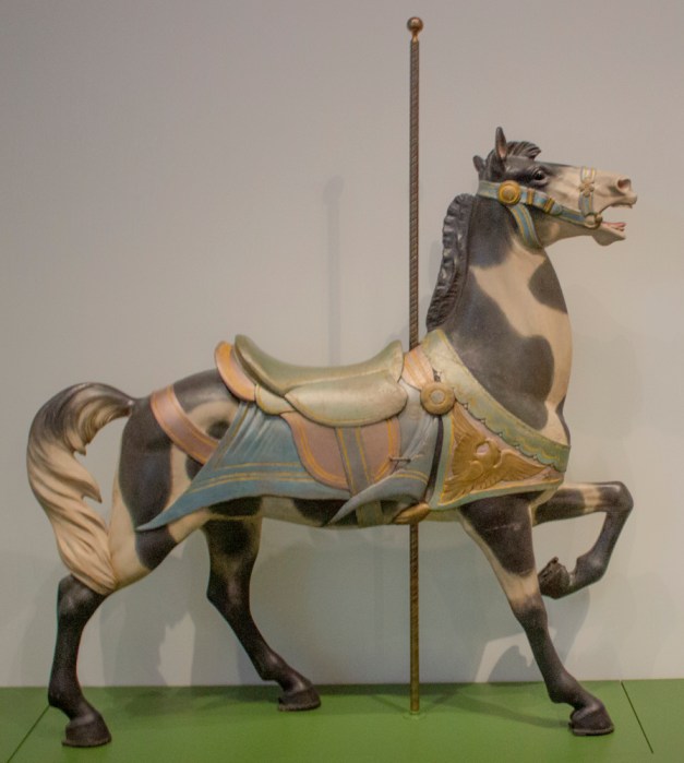Description: The sculpture depicts a standing horse, white with large black markings covering its body, with its proper left leg raised, and its nose lifted to be parallel with the ground, and its mouth open. The horse’s tail touches its proper right rear leg. It wears a bridle and a saddle blanket that are light blue with gold trim. The saddle itself is green and pink with similar gold trim. There is a carved fabric piece draped across its shoulders with an eagle decoration on the horse’s proper right side. The sculpture has large, black glass eyes. Beneath the saddle on both sides are rectangular iron eyelets.