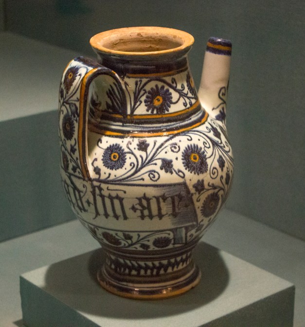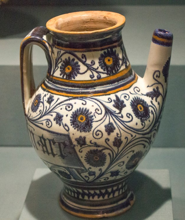 Pharmacies were great patrons of maiolica potteries from the early fifteenth century onward. Usually housed in monastic hospitals or royal residences, pharmacies often commissioned large sets of matching jars which were displayed in rows on shelves around the walls. Each jar was marked with the name of the drug it contained. Spouted jars were used to store and dispense liquid medicine. Early examples were closed by tying parchment over the top.