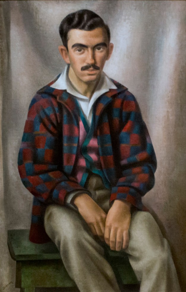 "An artist’s creative decisions shape the portraits they paint. Andrew Dasburg began this painting as a portrait of a ranch worker in Taos, New Mexico. When the worker moved away, Dasburg asked his former student Loren Mozley to model. Mozley remembered posing in front of a quilt, but Dasburg ultimately decided to paint him before a simple, gray backdrop. Mozley’s checkered jacket stands out because of this choice. Its pattern likely interested the artist who included similar abstract arrangements in other paintings."