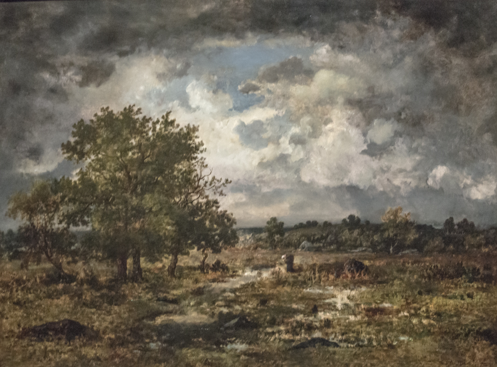 "As a storm begins to darken the sky, Narcisse Virgile Diaz de la Peña’s variegated, unrefined brushstrokes emphasize the rapidly changing light and atmosphere beyond a group of native oak trees. The locale, the Forest of Fontainebleau, was controversial because of its extensive plantings of Russian pine trees. The Barbizon artists strongly opposed this, viewing it as the destruction of the ancient Gallic character of the land."