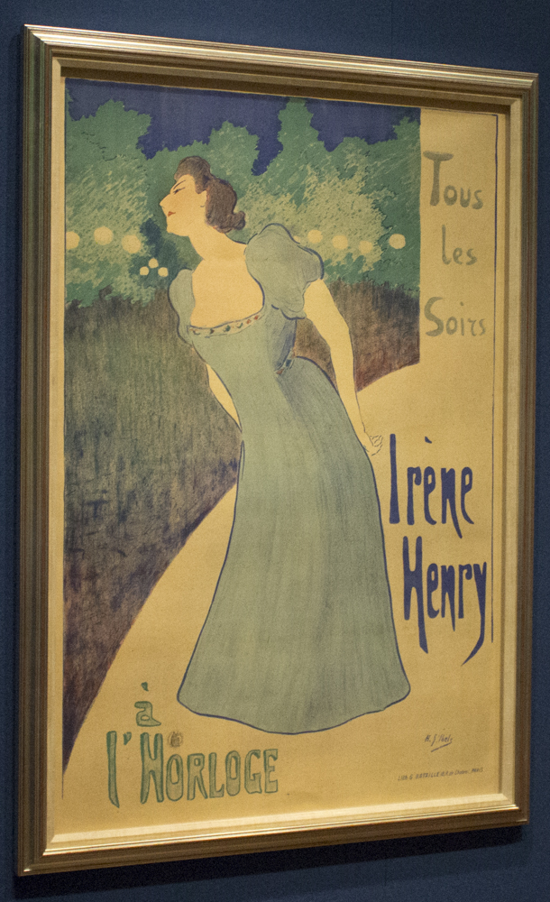 Henri-Gabriel Ibels was a prominent figure in avant-garde circles in 1890s Paris and well-known for his inventive poster designs, characterized by areas of flat color and a strong sense of decorative pattern. In this poster, he represents the singer Irène Henry performing outdoors at a café-concert, L'Horloge, on the Champs Élysées in Paris. Café-concerts enjoyed great popularity in late 19th century France and served as a more informal space (allowing consumption of food and drink) than more conventional concert halls. Here, Irène Henry artfully leans forward and is silhouetted against the trees, gas lights and evening sky. The poster announces that she performs "tous les soirs" or "every night."