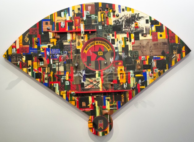 Mound Magician is rich with symbolism: vintage photographs of Negro League baseball, references to African countries and southern American cities, footprints running the bases, stamped arabesque patterns associated with Bailey's grandfather's wrought iron workshop, black baseballs, and vèvè, Voodoo symbols of ceremonial space. This assemblage also includes wrapped packets of "medicines" inspired by traditional African "power objects," sculptures to which various combinations of materials are added. These empowering substances are believed to positively affect the outcome of specific events.